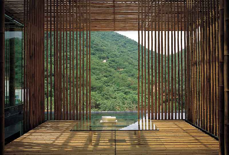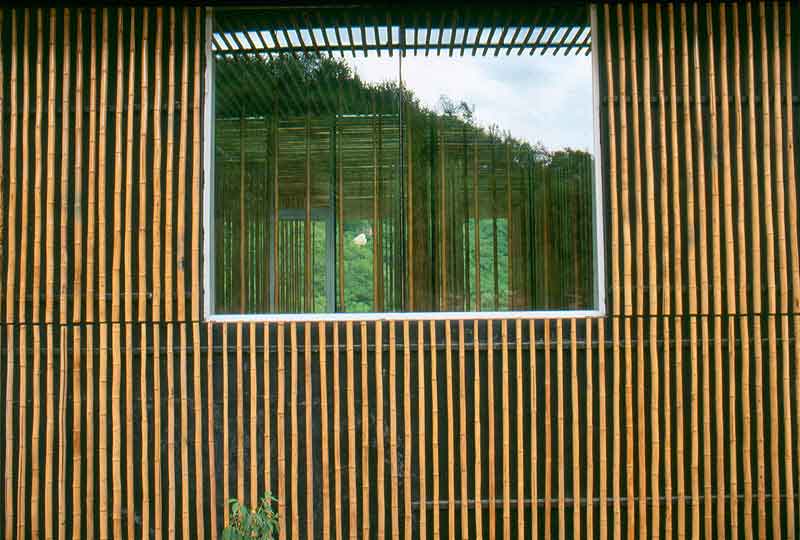 至于材料,既然它在中國與日本文化中具有獨特涵養,我們僅可能使用竹子。視竹子的密度與直徑,它提供了各種不同的空間分割。為了充分利用這些特性,我們決定放置一個竹子墻,就像長城一樣沿著基地斜面的一層竹子。長城在過去分隔了兩個文化,但這竹子墻將不只分隔而且將會多方面地聯合生活與文化,如此長城的一小部分。